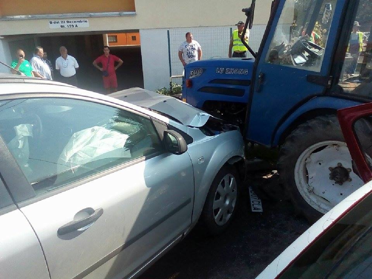 [FOTO-VIDEO] Victimă încarcerată după ce două maşini s-au lovit de un tractor