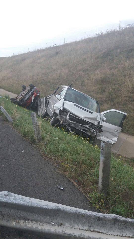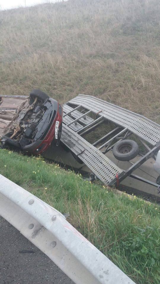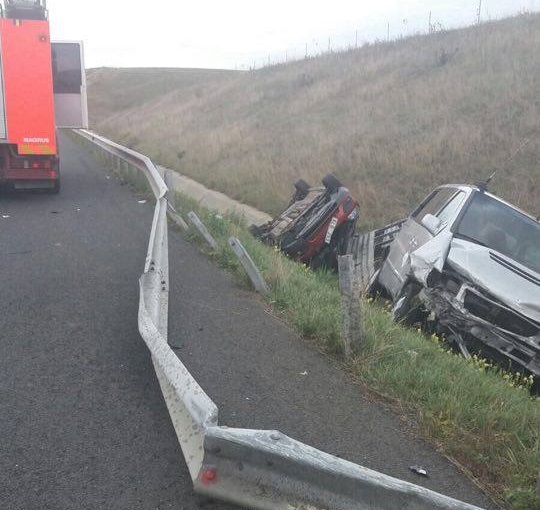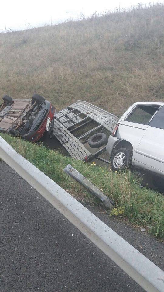 O dubă care transporta un alt autoturism pe o platformă s-a răsturnat după ce şoferul a pierdut controlul volanului. În dubă se aflau doi bărbaţi, de 25 şi 75 de ani.