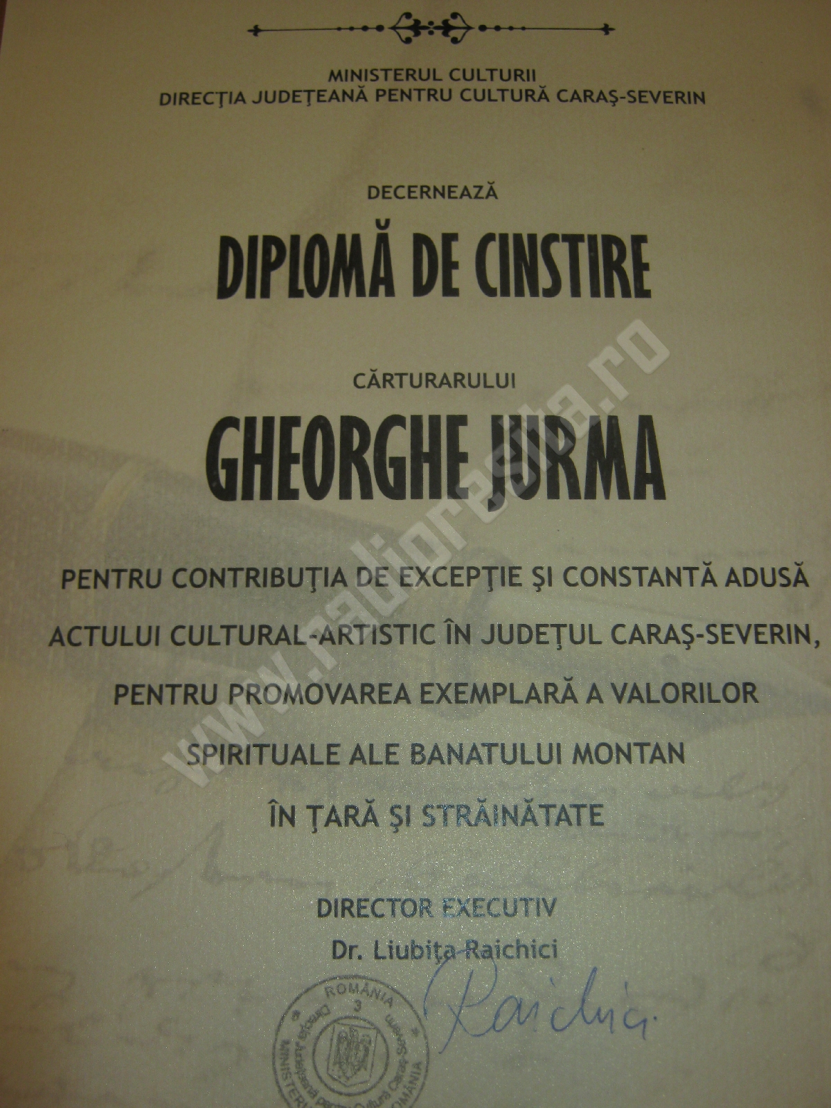 Palmaresul disticţiilor şi diplomelor aniversare primite de scriitorul Gheorghe Jurma cu prilejul împlinirii vârstei de 70 de ani s-a îmbogăţit cu încă două diplome de excelenţă primite din partea Direcţiei Judeţene pentru Cultură şi a Casei Corpului Didactic Caraş-Severin.
