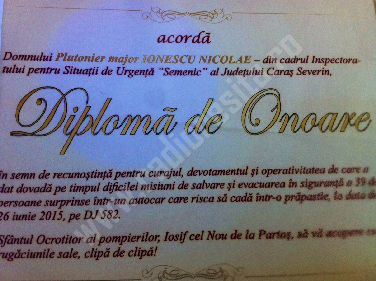 Și chiar de ziua lor, pompierii au fost în misiune. E drept, una simulată, dar care a încântat asistența. A fost stins un incendiu și s-a intervenit la un accident rutier în urma căruia o persoană a rămas încarcerată. Au fost doar două din exercițiile demonstrative prezentate la sediul ISU Semenic. Ceremonia militar- religiosă, care a precedat acestor activități a cuprins o paradă militară, avansări în grad, decernarea de diploma și distincții militarilor care s-au remarcat în misiunile reale din acest an și care au dat dovadă de “curaj și devotament”.