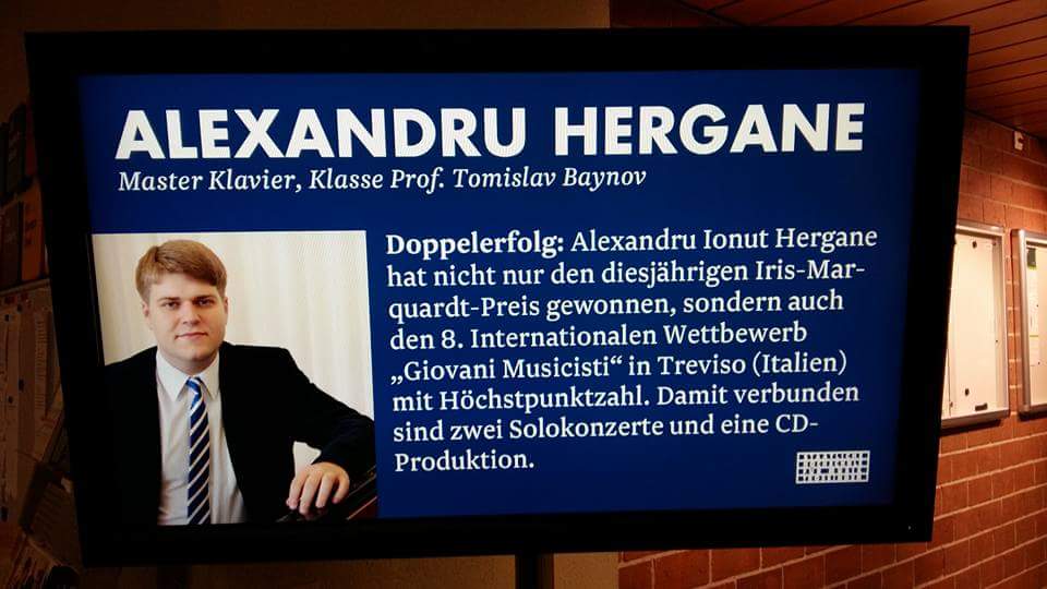 Chiar dacă se află departe de casă, unii dintre foştii elevi ai Liceului de Arte “Sabin Păutza” continuă să obţină succese şi premii importante pentru cariera lor. Două premii recente au fost câştigate de pianistul reşiţean Ionuţ Alexandru Hergane, respectiv “Premiul Marquardt” al Universităţii de Muzică din Trossingen – Germania şi Premiul I la Concursul Internaţional de Pian de la Treviso – Italia. Sunt premii care confirmă o dată în plus că talentul, doar susţinut de muncă asiduă, seriozitate şi, mai ales, dragoste pentru muzică, poate aduce laurii aşteptaţi, la care visează toţi cei care au îmbrăţişat drumul unei cariere solistice. Născut la Reşiţa, în 24 mai 1990, Ionuţ Alexandru Hergane a început să studieze pianul la Liceul de Arte “Sabin Păutza” din municipiul de pe Bârzava, la clasa prof.Doina Stănescu, a absolvit Liceul de Muzică “Sigismund Toduţă” şi Academia de Muzică “Gheorghe Dima” din Cluj – Napoca, în prezent el fiind masterand la Staatliche Hochschule fur Musik din Trossingen – Germania, la clasa prof.Tomislav Nedelkovic – Baynov. A studiat pianul şi sub atenta supraveghere a pianistului Daniel Goiţi, format şi el la Reşiţa care, de altfel, mândru de nepotul său ne-a împărtăşit bucuria acestor succese:
