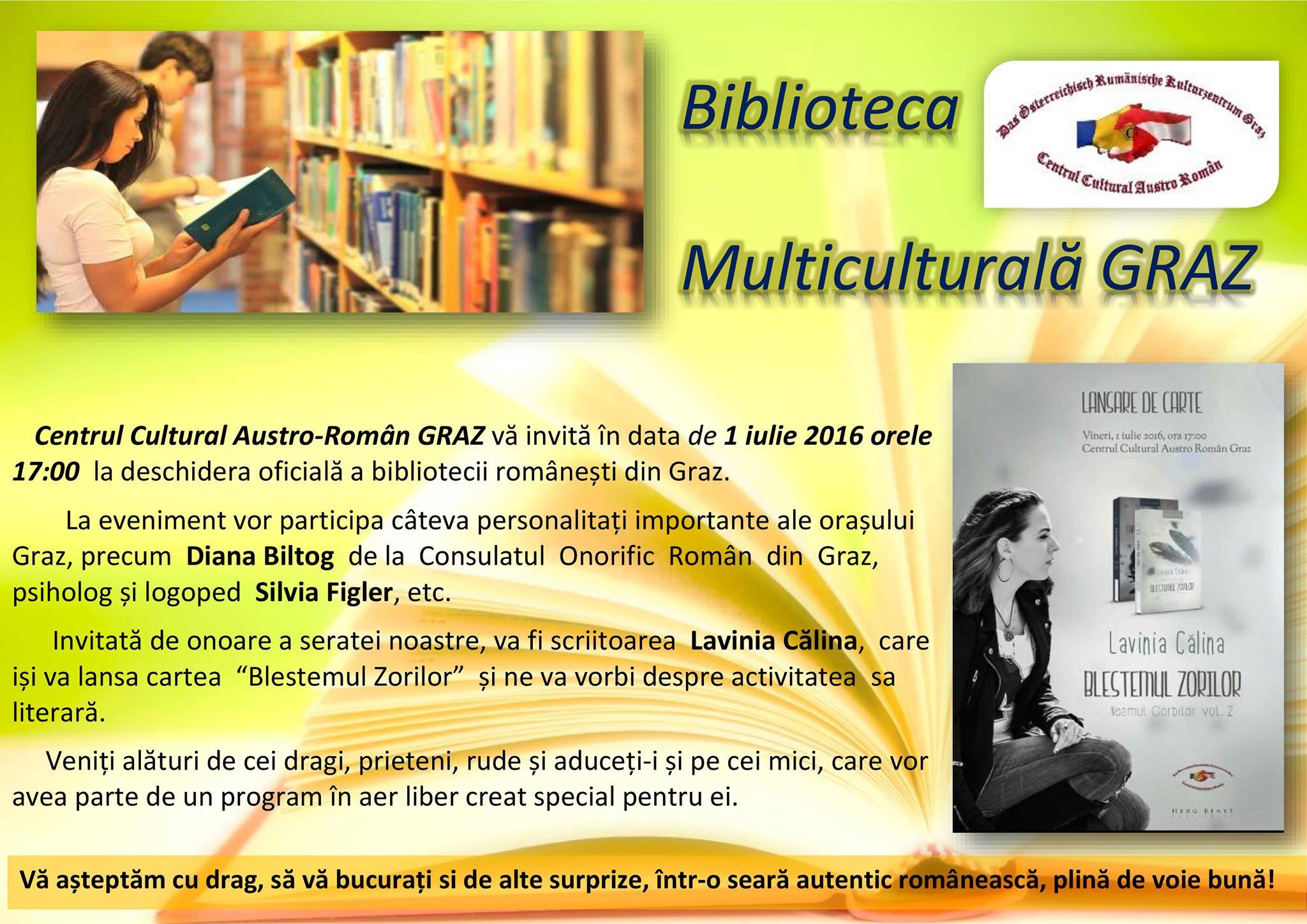 Lavinia Calina: „Mă bucur că am avut ocazia să particip la acest eveniment şi că a cincea mea cartea a avut parte de o primire călduroasa din partea comunităţii de români de aici. Chiar dacă seria Neamul Corbilor este un fantasy cu vrăjitoare, întâmplarea face ca parte din acţiunea romanului chiar se petrece în Graz, deci invitaţia a picat la fix. Am întâlnit oameni minunaţi ce mi-au demonstrat că literatura nu ţine cont de graniţe şi ne poate uni mereu. Le-am promis că am să revin şi când o sa iasă ultimul volum din serie şi abia astept să o fac.”