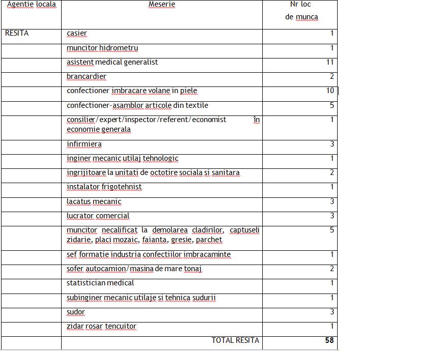 Agenția Județeană de Ocupare a Forței de Muncă anunță 90 de posturi vacante în Caraș-Severin. Cele mai multe în municipiul Reșița. Printre cele mai căutate meserii sunt cele de asistent general și infirmier. Sunt vizați și confecționeri în industria textilă dar și muncitorii necalificați.