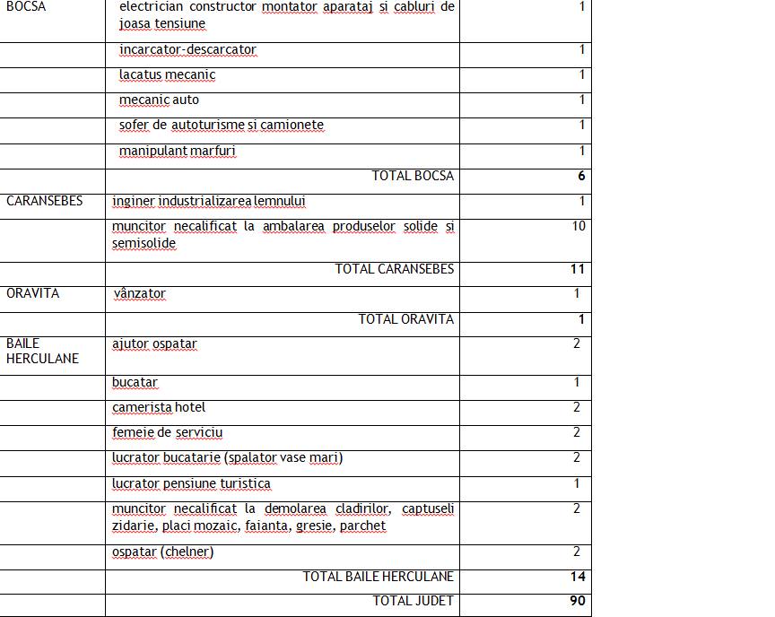 Cele mai puține posturi sunt în Oravița, unde se caută un vânzător. La Bocșa sunt 6 posturi disponibile pentru electrician constructor montator aparataj și cabluri de joasă tensiune, lăcătuș mecanic, mecanic auto, șofer de autoturisme și camionete, manipulant mărfuri.