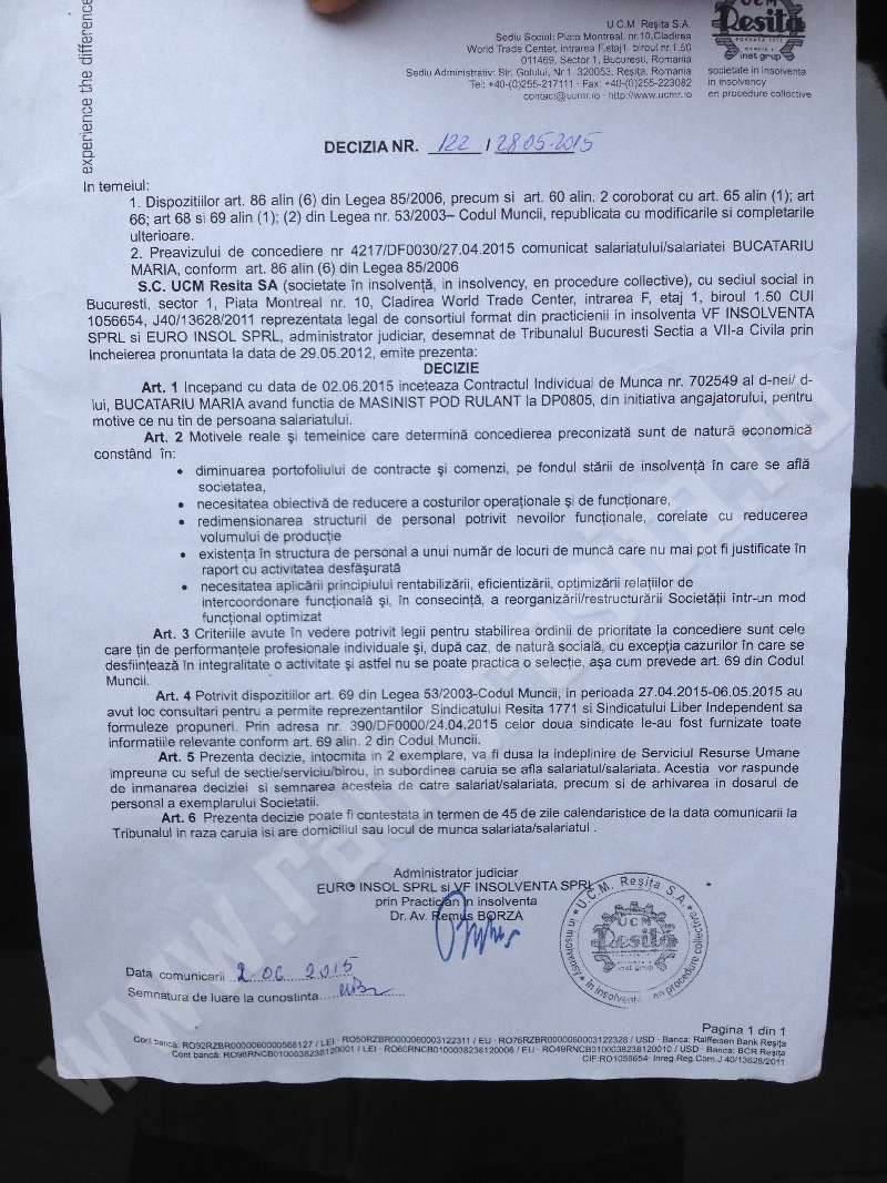 Peste 20 de persoane disponibilizate de la UCM Reşiţa s-au întâlnit astăzi cu directorul executiv, Cosmin Ursoniu. Foştii angajaţi sunt nemulţumiţi că nu primesc nici salarii compensatorii şi nici ajutor de şomaj. Directorul invocă faptul că societatea se află în insolvenţă şi nu trebuie să facă plăţi pentru ajutorul de şomaj, conform reprezentantului sindicatului Reşiţa 1771 Ciprian Pop. Acesta a mai spus că problema trebuie rezolvată de AJOFM şi Ministerul Finanţelor. Foştii angajaţi sunt decişi să meargă în instanţă, după ce îşi angajează un avocat.