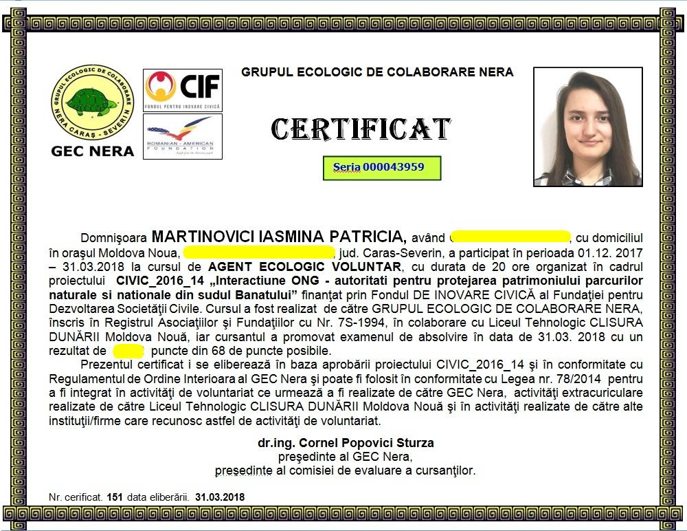 Înmânarea certificatelor precum şi acordarea unor premii celor 28 de participanţi la curs s-a făcut într-un cadru festiv la sediul Liceului CLISURA DUNĂRII din Moldova Nouă, evenimentul  fiind înclus în săptămâna ŞCOALA ALTFEL 2018 realizată în cadrul acestui liceu.