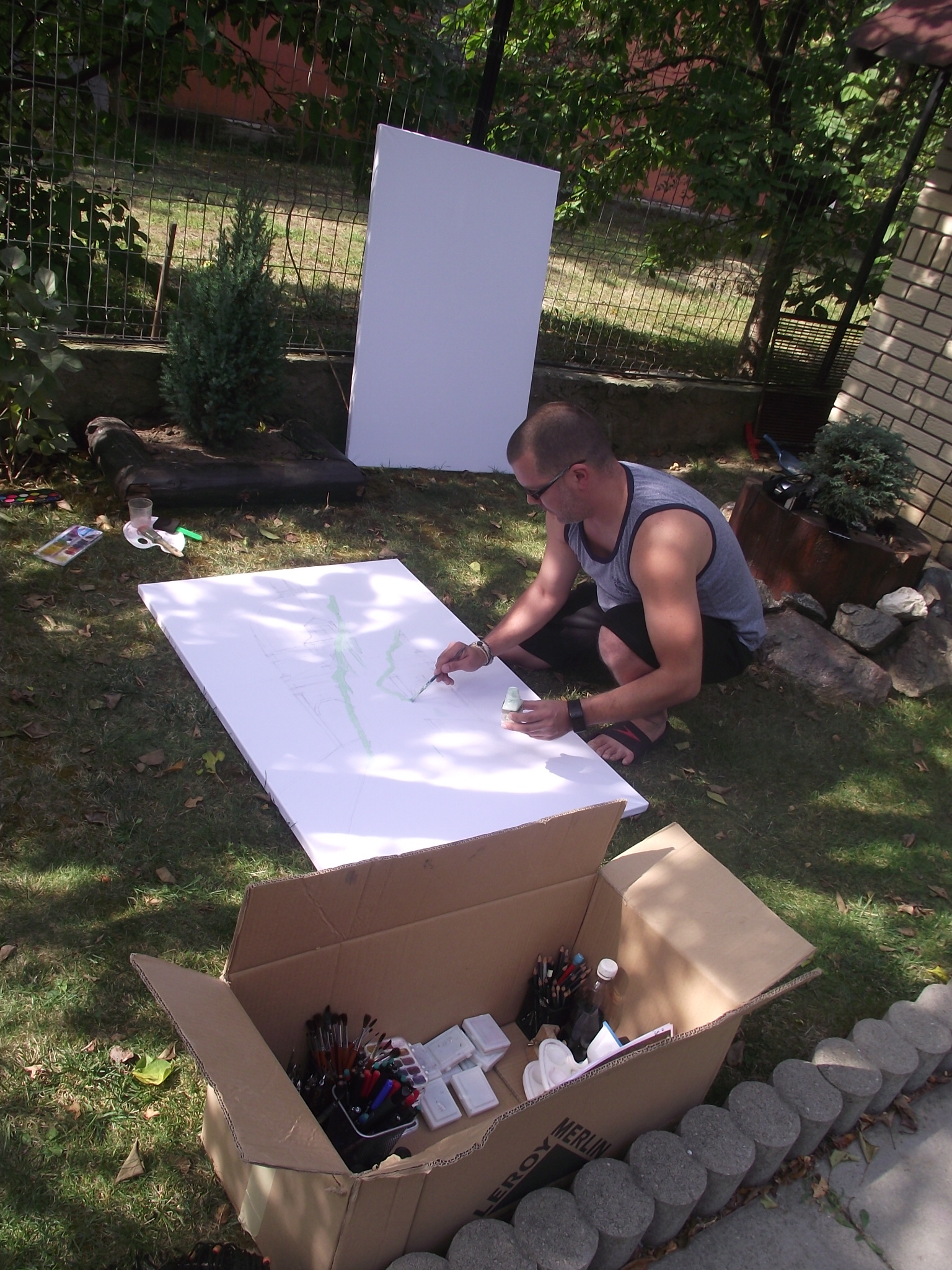 Claudiu Adin Radu : „Aici avem Gara din Băile Herculane, cu o alegorie între o scenă de vânătoare de la 1800, gara fiind iniţial o casă de vânătoare construită Împăratul Franz Joseph al Austriei şi în partea dreaptă avem partea nouă, partea modernă, cu un tren de actualitate care uneşte scena, vechiul cu noul! Acum lucrăm la o scenă cu băile austriece, în care încercăm să reflectăm, din păcate, situaţia lor de acum, cu nişte culori mai ruginii, mai pierdute!”