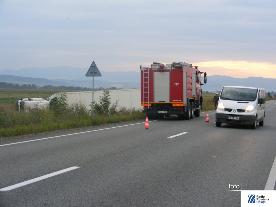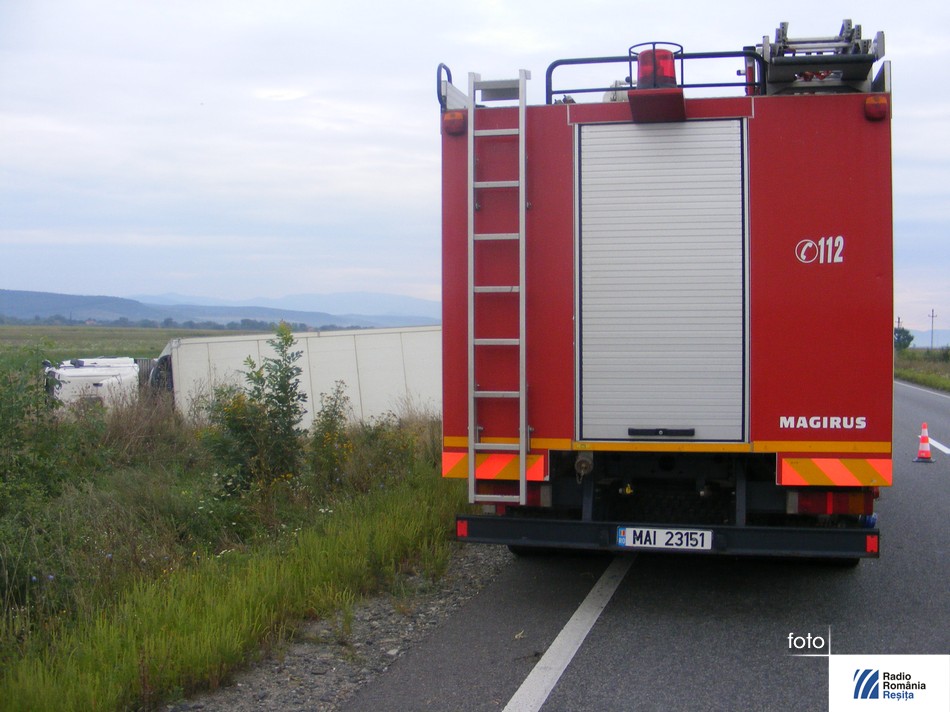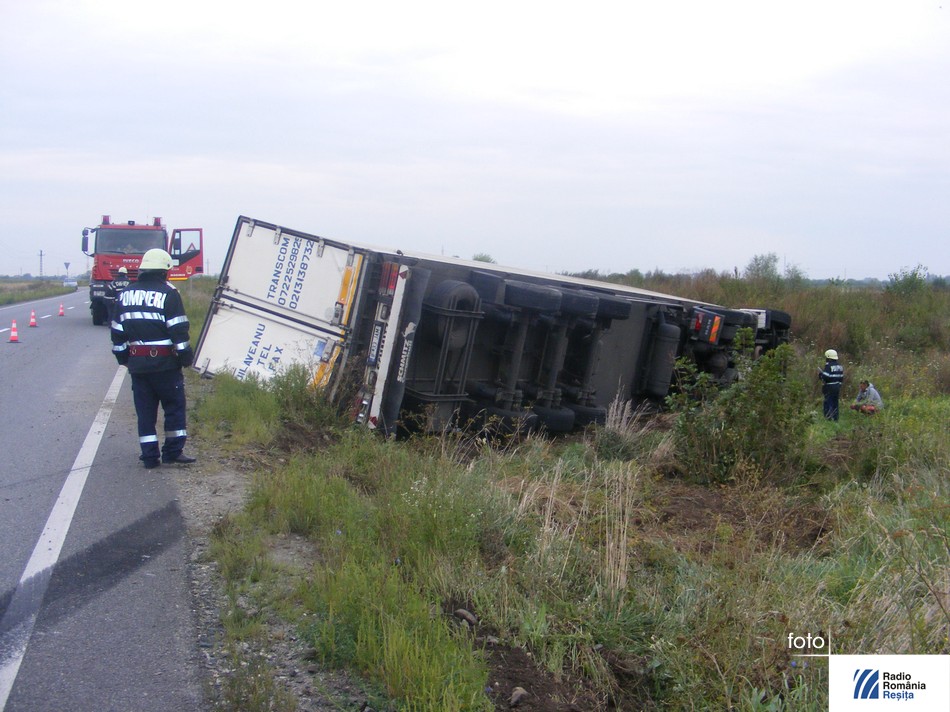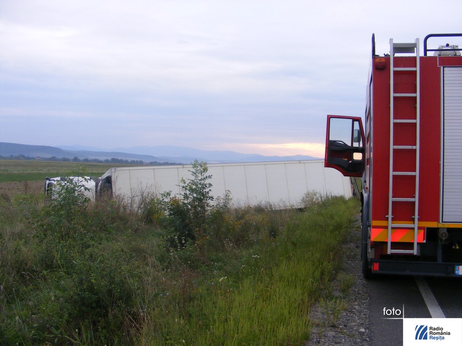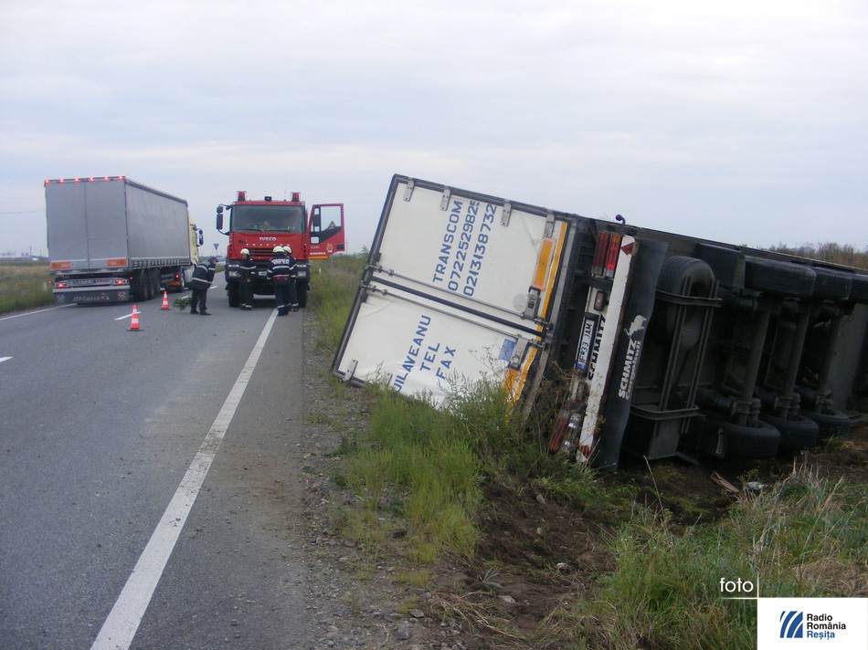 Angajaţii Inspectoratului pentru Situaţii de Urgenţă Timiş au asigurat în această dimineaţă măsurile PSI la intrarea în municipiul Lugoj dinspre Caransebeş, unde un tir încărcat cu produse lactate s-a răsturnat într-un şanţ.