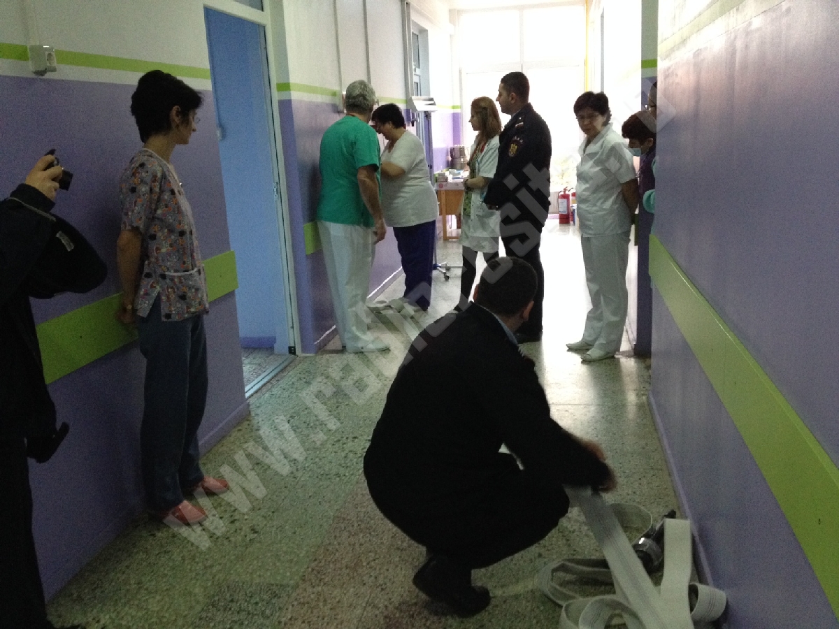 Personalul medical de la neonatologie a fost instruit cum să acţioneze în caz de incendiu. După ce s-a verificat şi modul de funcţionare a instalaţiilor de alimentare cu apă, pompierii au trecut la proba practică. Medicii, asistentele şi infirmierele au urmărit cu atenţie operaţiunea de stingere a incendiului. Aceştia au învăţat cum să ţină corect în mână furtunul hidrantului pentru a nu se accidenta şi cum să izoleze zona în care a izbucnit incendiul până la venirea pompierilor. Cea mai amuzantă parte a instrucţiei a fost atunci când pompierii au rugat cadrele medicale să se deplaseze în genunchi cât mai aproape de sol până ajung la ieşire deoarece în timpul unui incendiu fumul se adună în partea de sus a tavanului, iar dacă rămân în picioare se pot întoxica rapid.