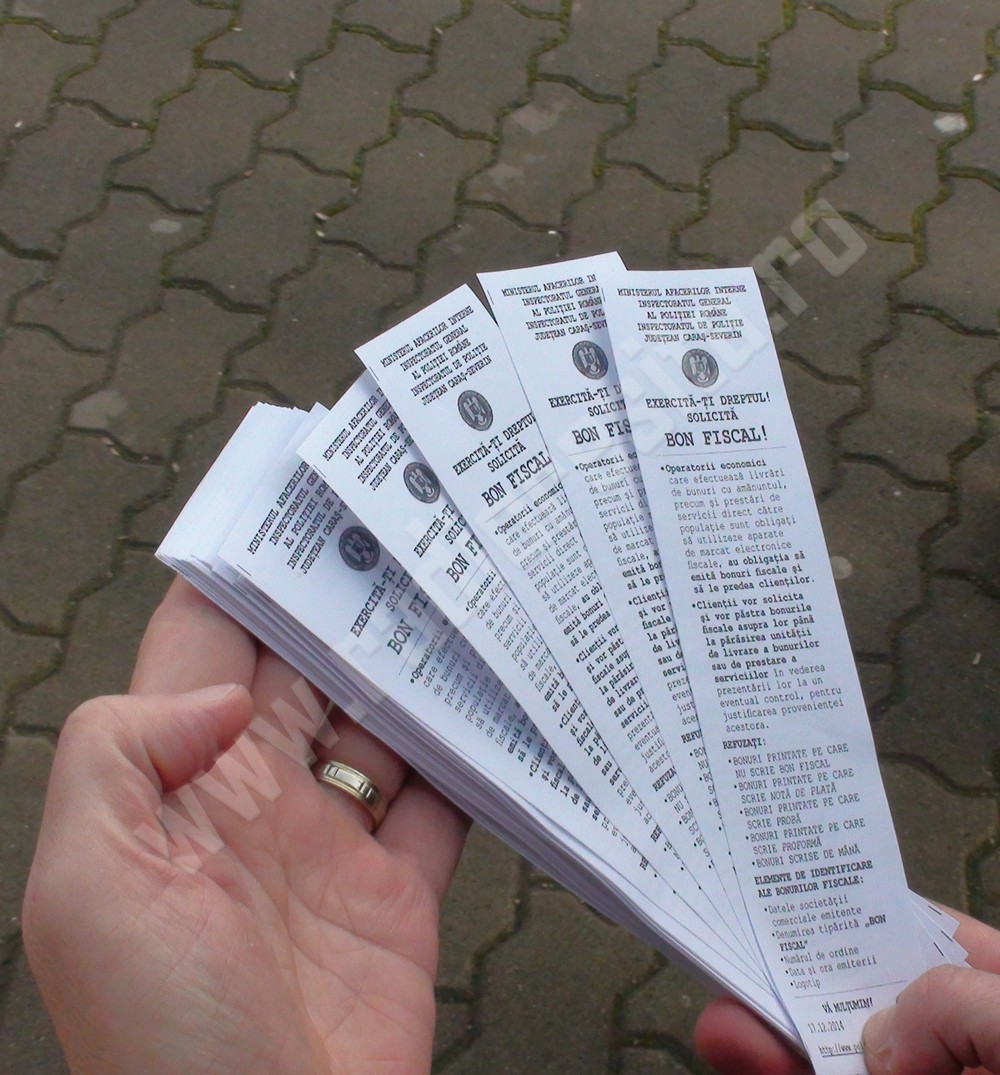 Poliţiştii au oferit fiecărui interlocutor întâlnit astăzi în Reşiţa câte un „Bon Fiscal”, în fapt un flyer în care au fost punctate obligaţiile operatorilor economici, drepturile clienţilor, dar şi câteva elemente prin care pot fi identificate bonurile fiscale.