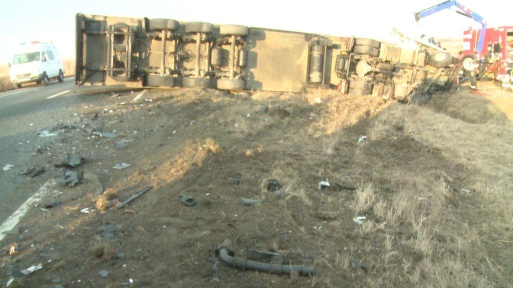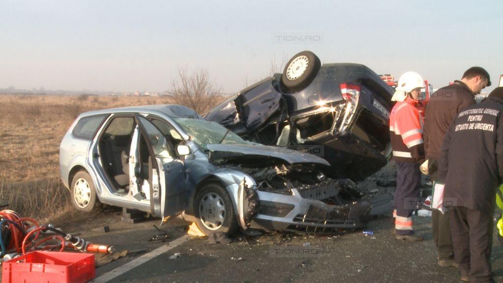 Două persoane şi-au pierdut viaţa, în această dimineaţă,  într-un grav accident de circulaţie petrecut pe DN6 Timişoara – Lugoj, la kilometrul 548+200 de metri, în zona Remetea, ne-a informat purtătorul de cuvânt al Inspectoratului pentru Situaţii de Urgenţă „Banat” al judeţului Timiş, Sindia Onescu. Un autoturism a intrat în depăşire şi a lovit frontal un autotren, fiind proiectat în autoturismul pe care îl depăşea.  Conducătorii auto ai celor două maşini au murit pe loc, iar şoferul autotrenului a rămas încarcerat în cabină şi se află în stare gravă. La faţa locului s-au deplasat 4 ambulanţe şi mai multe echipaje de descarcerare. Traficul rutier este complet blocat. Şoferii care vin dinspre Lugoj sunt redirecţionaţi spre autostradă, iar maşinile din direcţia Timişoara au fost deviate spre DJ 691 Giarmata, a declarat în direct pe postul nostru de radio agent principal Mirela Drăghicioiu din cadrul IPJ Timiş. Poliţiştii efectuează cercetări pentru a se stabili circumstanţele în care s-a produs accidentul. (Alina Bradaci)