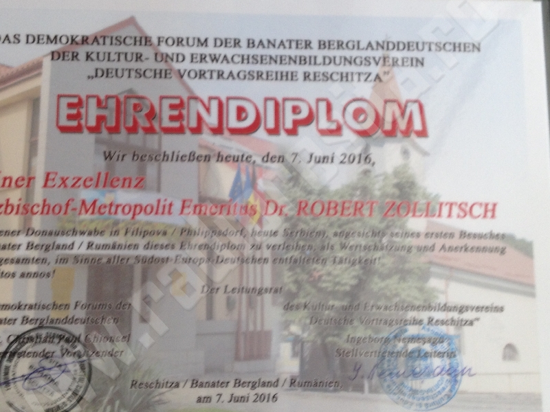 Robert Zollitsch născut în Voivodina, Banatul sârbesc a fost arhiepiscop de Freiburg între 2003-2013 și președinte al Conferinței Episcopilor Catolici din Germania din 18 februarie 2008 până în 12 martie 2014. La invitaţia Excelenţei Sale Rolf Maruhn – consulul Germaniei la Timişoara şi a preşedintelui Forumului Democratic al Germanilor din Caraş-Severin, Erwin Josef Ţigla, în periplul său spre plaiurile natale din Bacica, Robert Zollitsch a vizitat şi comunitatea etnicilor germani din sud-vestul României. Care a fost scopul prezenţei Excelenţei Sale în mijlocul şvabilor dunăreni din Banatul montan am aflat de la acesta: