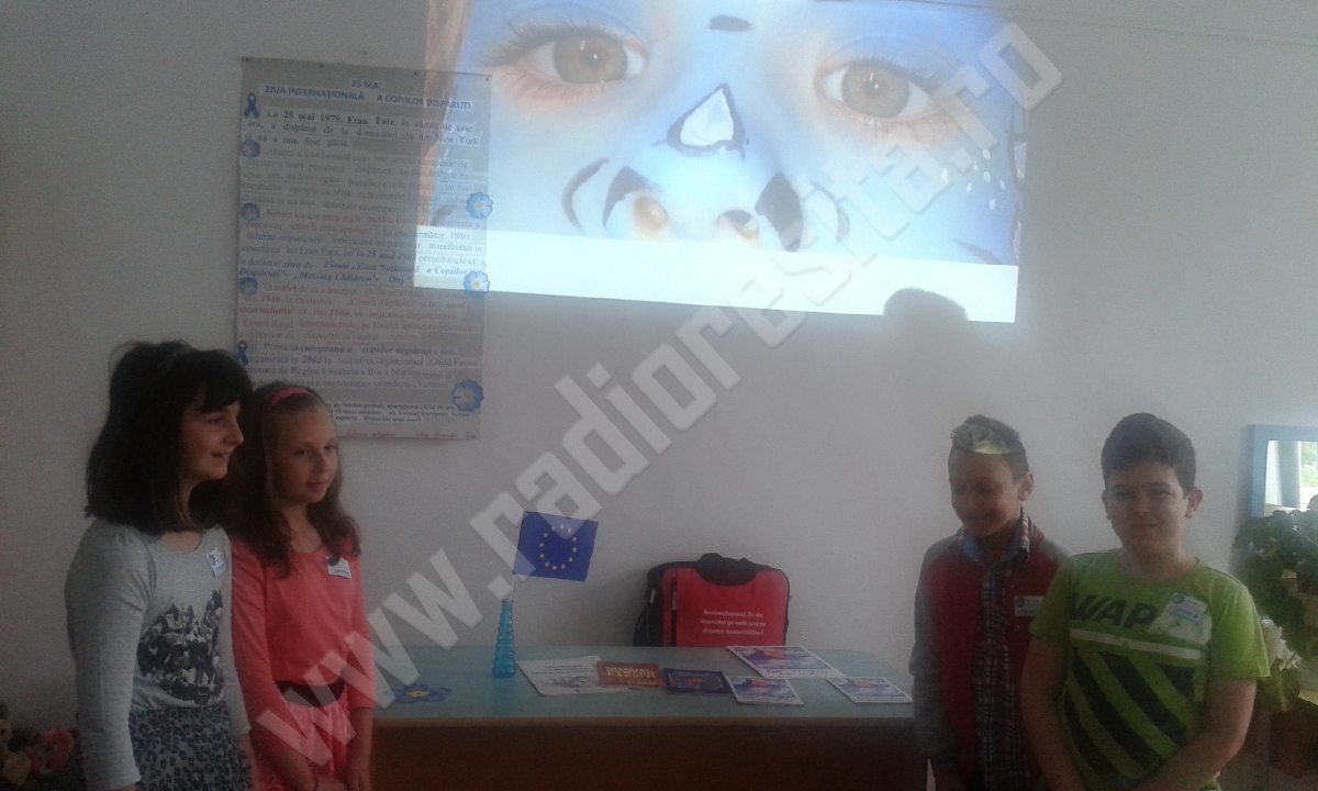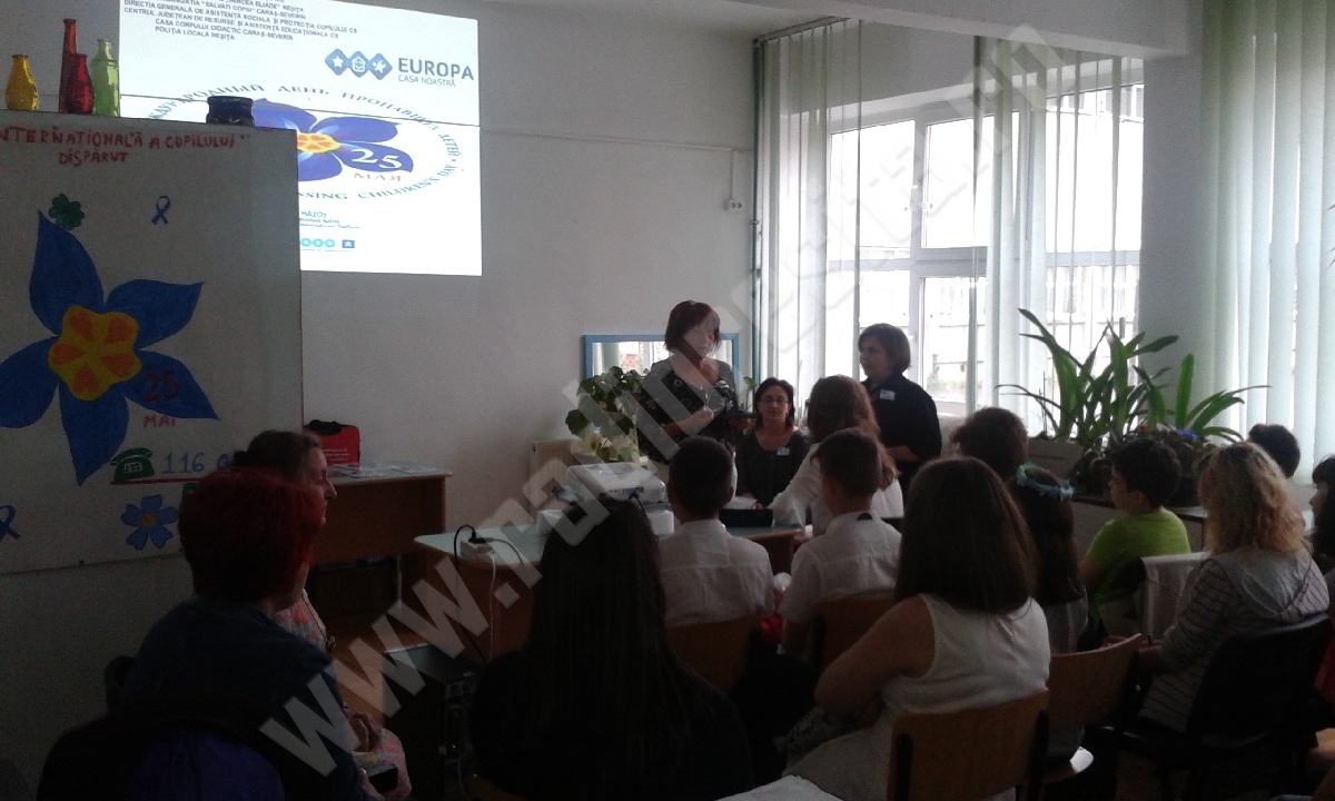 Ziua internaţională a copiilor dispăruţi a fost sărbătorită astăzi la Colegiul Național ”Mircea Eliade” din municipiul Reșița. Lucrările întâlnirii au început cu detalii despre “Semnificația zilei de 25 mai și importanța implicării în rezolvarea situațiilor riscante pentru copii”. Acțiunea, inițiată de instituția de învățământ și Organizația Salvați Copiii Caraș-Severin a cuprins: o proiecție a statisticii realizate la nivel mondial în ceea ce privește numărul copiilor dispăruți, o expoziție de desene realizate de elevi și preșcolari și discuții despre cauze ale dispariției copiilor, abuzul asupra lor, problemele din familie, conflicte între generații. Psihologul Mariana Băran speră că cei peste 20 de elevi prezenți au recepționat mesajul transmis de organizatori: