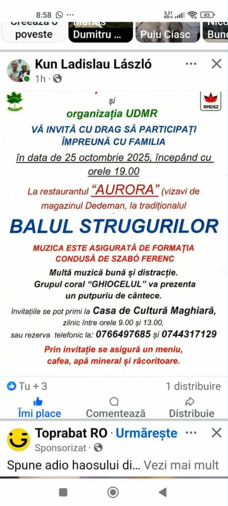 Tradiția continuă la Reșița, unde comunitatea maghiară, alături de organizația UDMR, îi invită pe locuitori să participe la Balul Strugurilor 2025, un eveniment plin de voie bună și culoare locală. Manifestarea va avea loc sâmbătă, 25 octombrie 2025, începând cu ora 19:00, la restaurantul „Aurora”, situat vizavi de magazinul Dedeman.