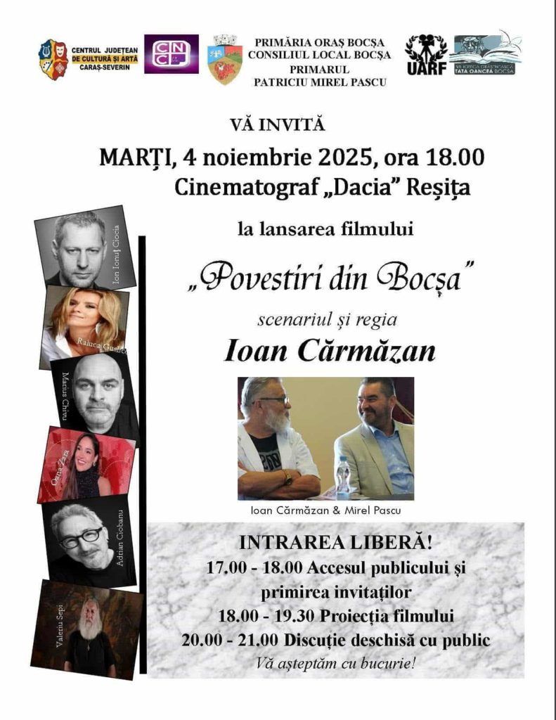 Iubitorii de film sunt invitați marți, 4 noiembrie 2025, de la ora 18:00 la Cinematograful „Dacia” din Reșița pentru a participa la lansarea oficială a filmului „Povestiri din Bocșa”, o producție semnată de renumitul regizor și scenarist Ioan Cărmăzan. Evenimentul este organizat de Primăria Orașului Bocșa, Consiliul Local Bocșa și Centrul Județean de Cultură și Artă Caraș-Severin, cu sprijinul Uniunii Autorilor și Realizatorilor de Film din România (UARF) și al Fundației „Tata Oancea” Bocșa.