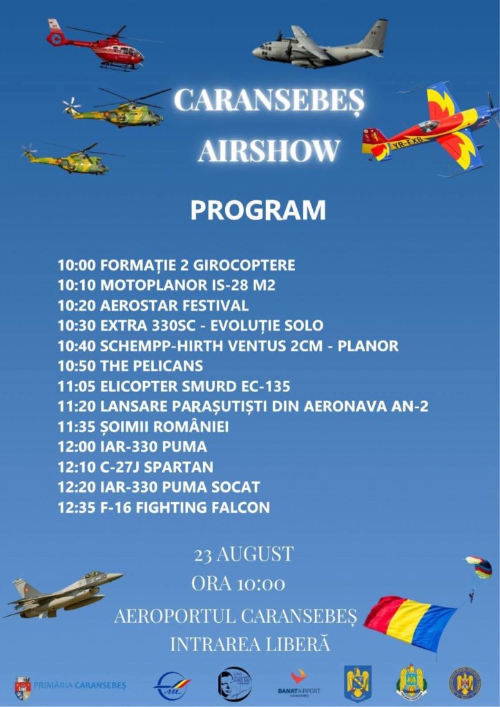 Începând cu ora 10:00, cerul Caransebeșului va prinde viață cu evoluțiile impresionante ale Hawks of România, care vor demonstra acrobații aeriene de mare precizie, atât în formație, cât și solo. Publicul va putea urmări și salturile spectaculoase ale formației de parașutiști The Pelican’s. Si zborurile demonstrative ale aeronavelor Forțelor Aeriene Române: avioanele de luptă F-16, aeronava de transport Spartan și elicopterul IAR 330.