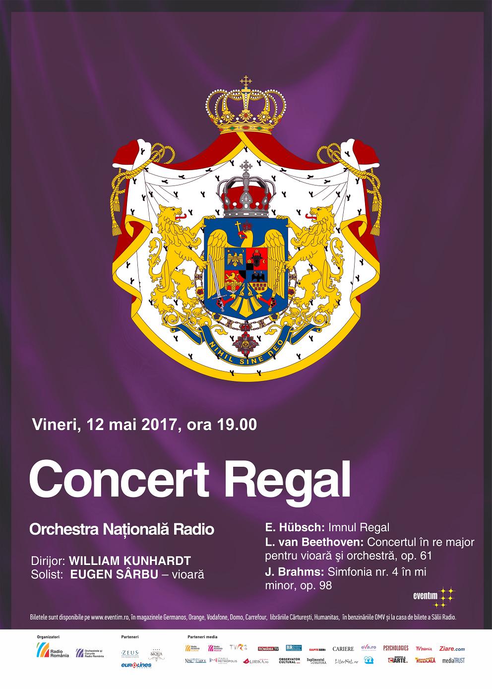 Vineri, 12 mai, ora 19:00, Orchestra Naţională Radio sărbătoreşte Ziua Regalităţii printr-un concert special, sub bagheta dirijorului britanic William Kunhardt, cu participarea violonistului Eugen Sârbu, singurul muzician român menţionat, alături de George Enescu, în celebra publicaţie Oxford Dictionary of Music.