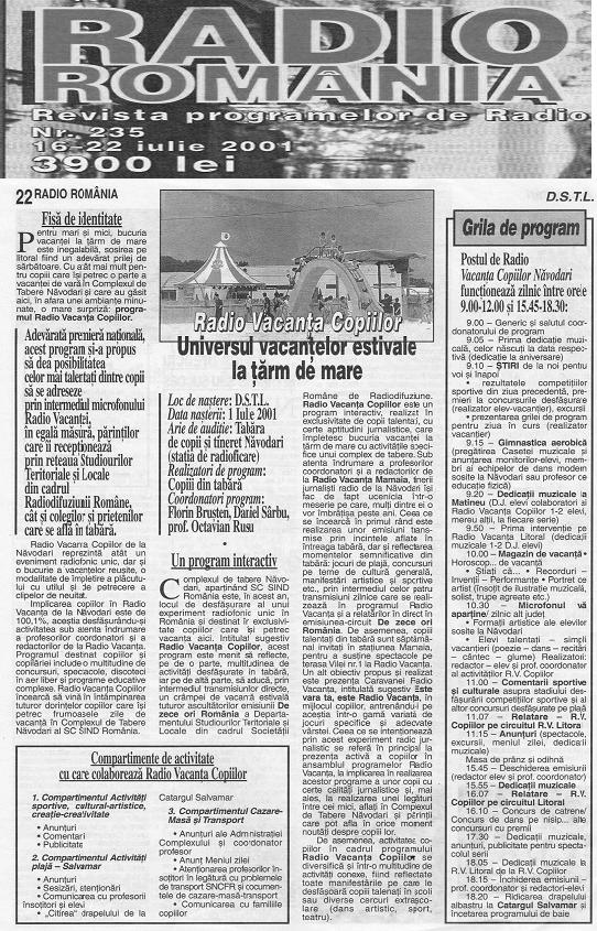 Radio Vacanta copiilor Navodari Revista Radio Romania iulie 1994Radio Vacanţa Copiilor Năvodari – Revista Radio România 16-22 iulie 2001
