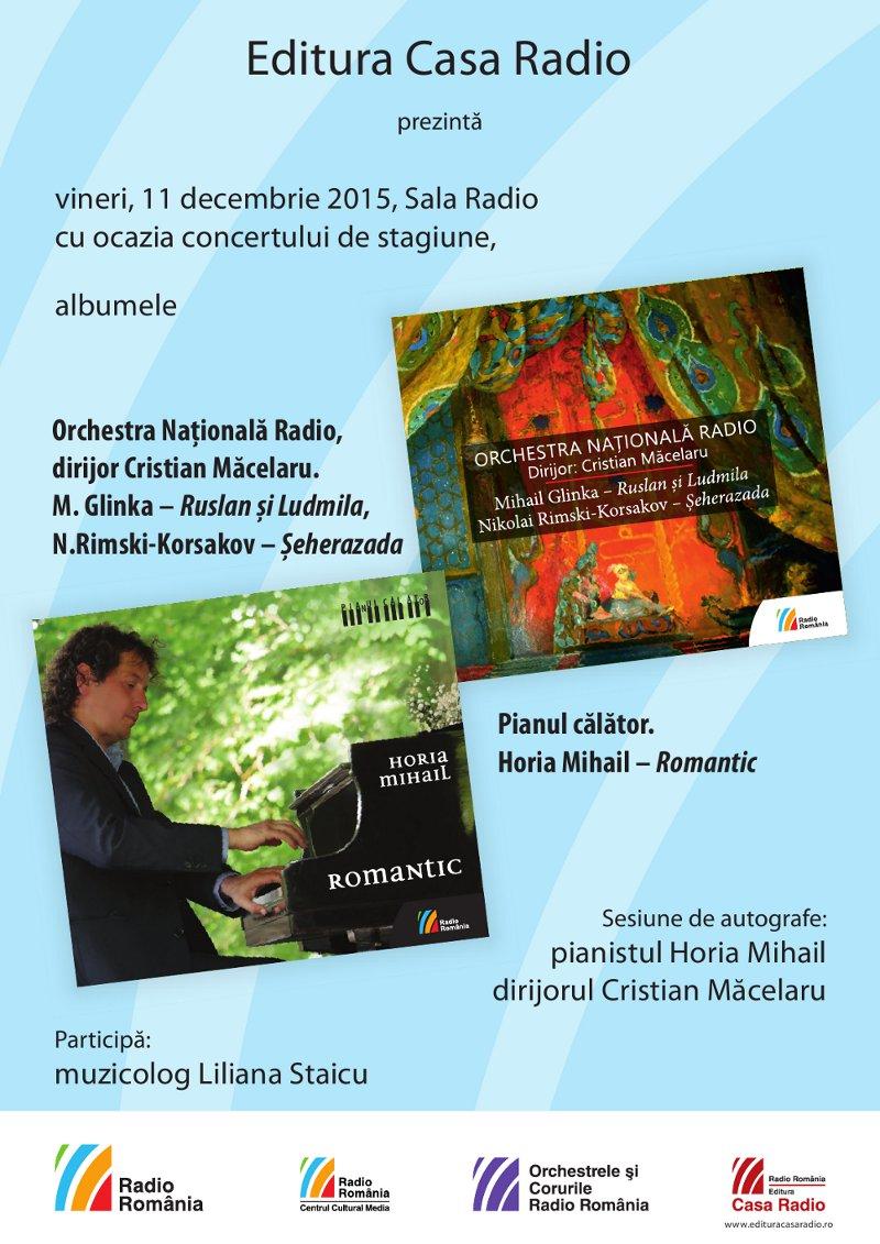 Cu ocazia concertului de vineri, 11 decembrie, spectatorii prezenţi la Sala Radio sunt aşteptaţi şi la o dublă lansare & sesiune de autografe oferite de pianistul Horia Mihail şi dirijorul Cristian Măcelaru. Dintre cele două albume prezentate, primul este Pianul călător. Horia Mihail – Romantic, cuprinzând Suitele Carnavalul op. 9 şi Scene de copii op. 15 de Robert Schumann şi Şase Piese pentru pian op. 118 de Johannes Brahms. Este realizată, astfel, o reflectare sintetică a turneului naţional Pianul călător – ediţia 2015, la începutul căruia muzicologul Oltea Şerban-Pârâu, cea care semnează textul de prezentare al acestui album, afirma: „Horia Mihail porneşte într-o nouă călătorie pe drumul pianistului de cursă lungă, încercând să demonstreze că romantismul poate avea nuanţe foarte diferite şi poate însemna pentru fiecare dintre noi cu totul altceva. Cei doi mari creatori ai repertoriului pianistic pe care i-a ales pentru acest CD îi oferă şansa de a genera în cei care îl ascultă o nesfârşită paletă de emoţii.”