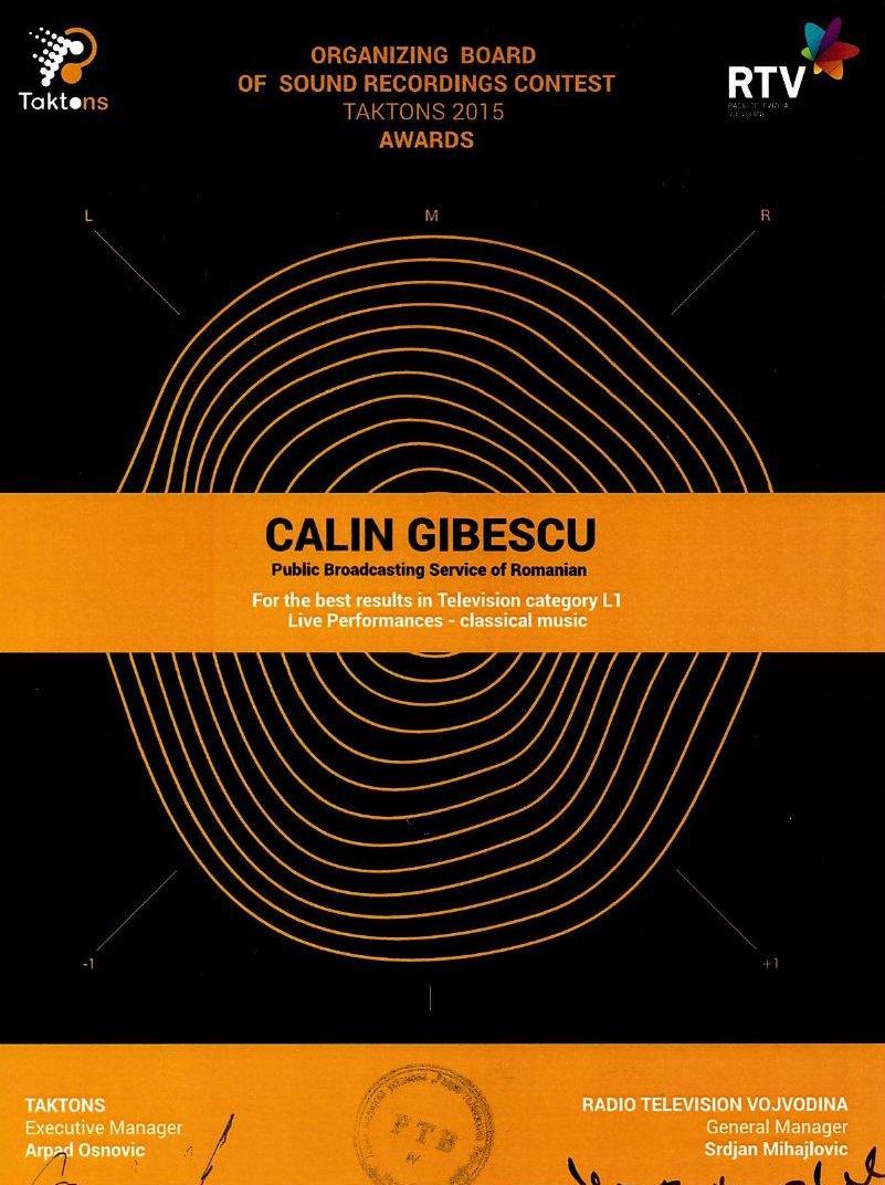 Premiul I pentru cea mai bună înregistrare, la categoriile muzică clasică – solist, grupuri mici – spectacol cu public (ing. Mihai Alboaie); pop, rock, jazz – big band şi orchestre – înregistrări de studio (ing. Călin Gibescu), categoria muzică clasică – spectacol cu public – producţie audio-video (ing. Călin Gibescu).