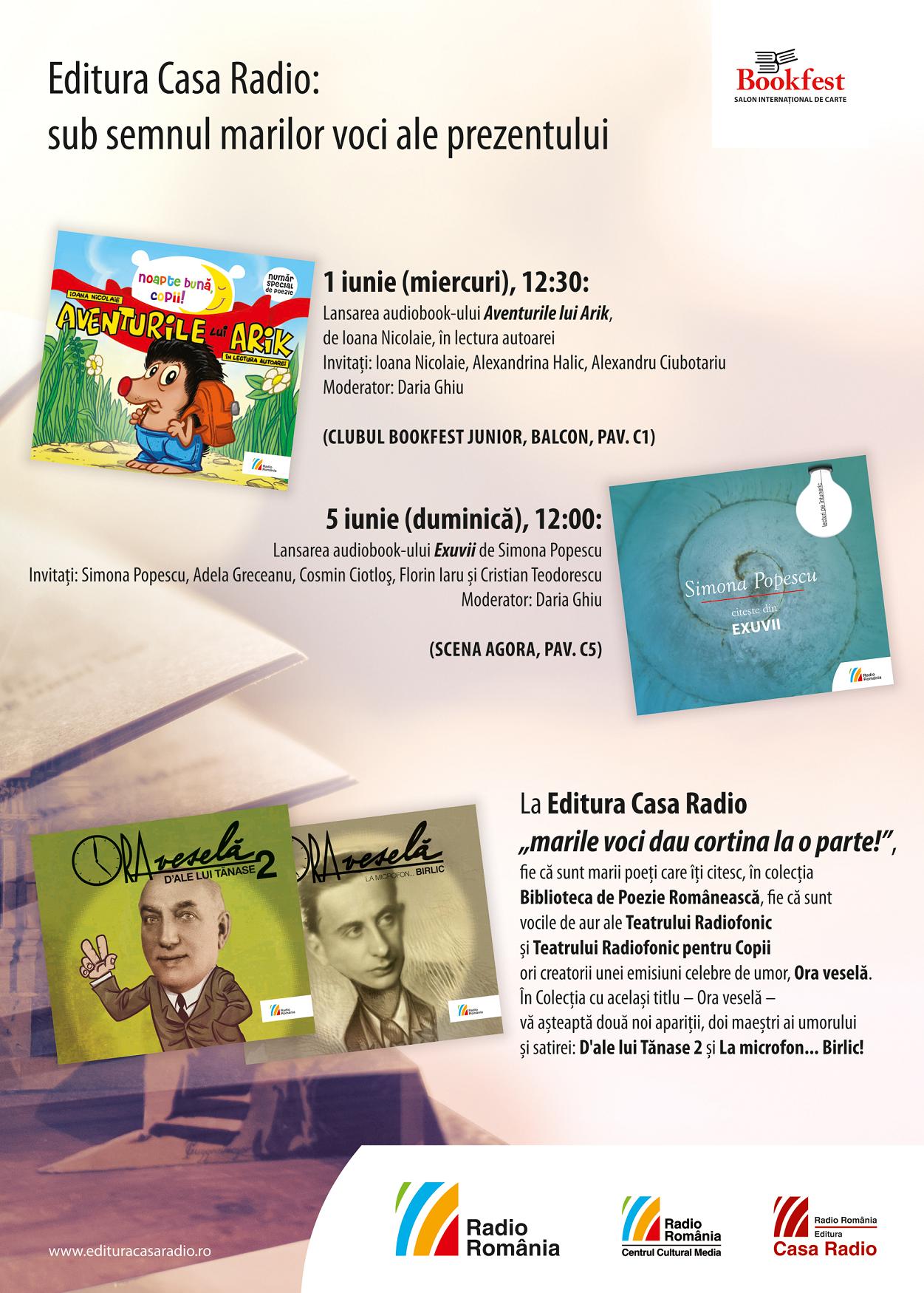 Vă invităm aşadar la două întâlniri cu scriitori contemporani: Ioana Nicolaie şi Simona Popescu. Aventurile lui Arik în lectura autoarei, poeta Ioana Nicolaie, este un nou audiobook în prestigioasa colecţie Noapte bună, copii! Editura Casa Radio vă invită miercuri, 1 iunie, de Ziua Copiilor, de la ora 12:30, la o întâlnire cu Arik şi creatoarea lui, Ioana Nicolaie. Alături de autoare, vor fi prezenţi la lansare Alexandrina Halic şi Alexandru Ciubotariu, artistul care îl va desena în culori sub ochii copiilor pe micuţul Arik. Lansarea are loc la Clubul Bookfest Junior, Balcon, Pavilion C1.