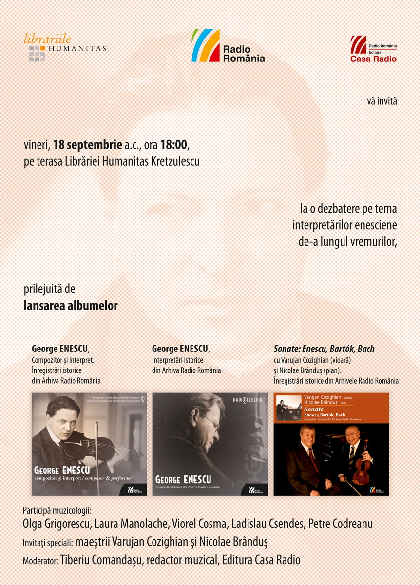 Vă invităm, vineri, 18 septembrie a.c., ora 18:00, pe terasa Librăriei Humanitas Kretzulescu la o dezbatere pe tema interpretărilor enesciene de-a lungul vremurilor, să ne fiţi alături la aceste mari întâlniri cu muzica şi maeştrii săi din toate timpurile!