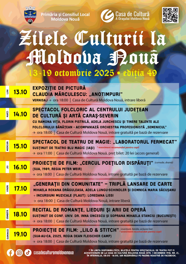 Prin sprijinul Primăriei și Consiliului Local Moldova Nouă, Casa de Cultură devine, timp de o săptămână, un loc al diversității, creativității și întâlnirilor culturale. Cu această ocazie, publicul de toate vârstele este invitat să descopere și să trăiască emoția artei.