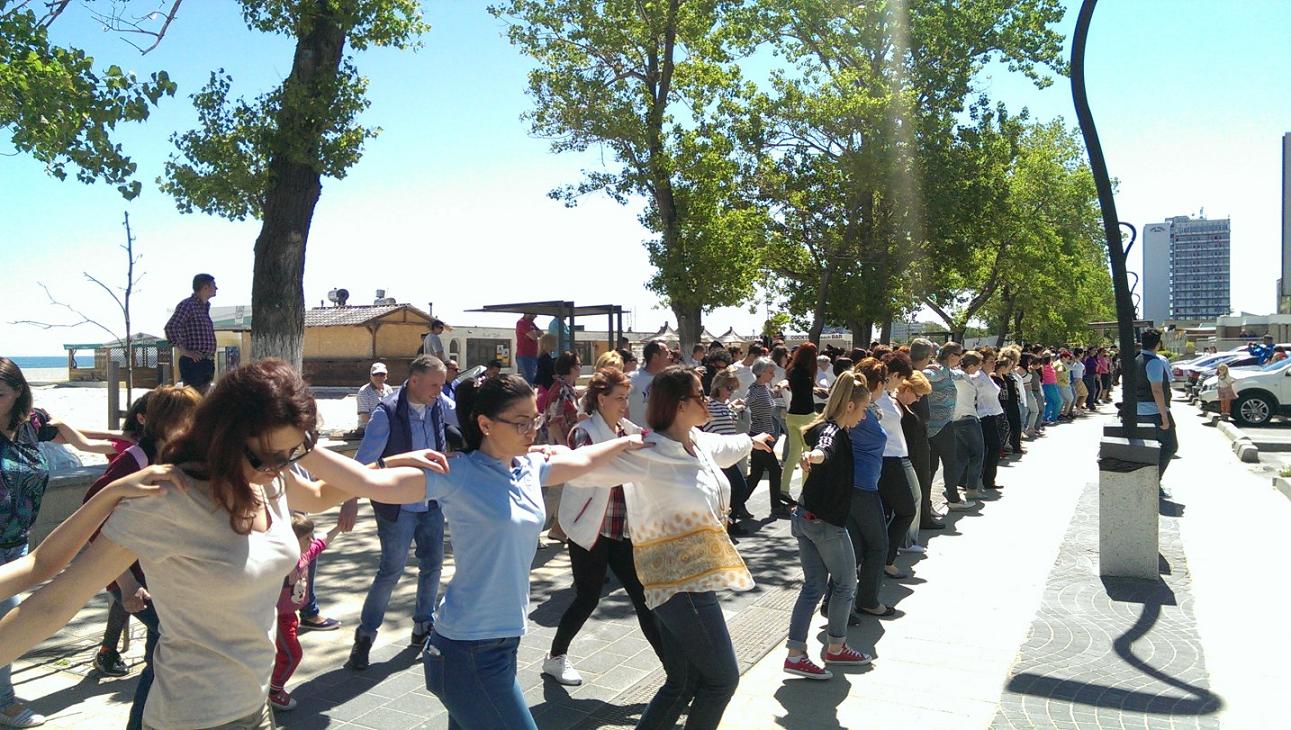 Pe faleza din faţa sediului Radio Constanţa/Radio Vacanţa au avut loc, sâmbătă, 13 mai, aproape două ore de repetiţii generale. Sute de voluntari de toate vârstele au învăţat paşii şi coregrafia, sub îndrumarea instructorului de dans Teodora Pârlea, coordonatorul Ansamblului Elpis.