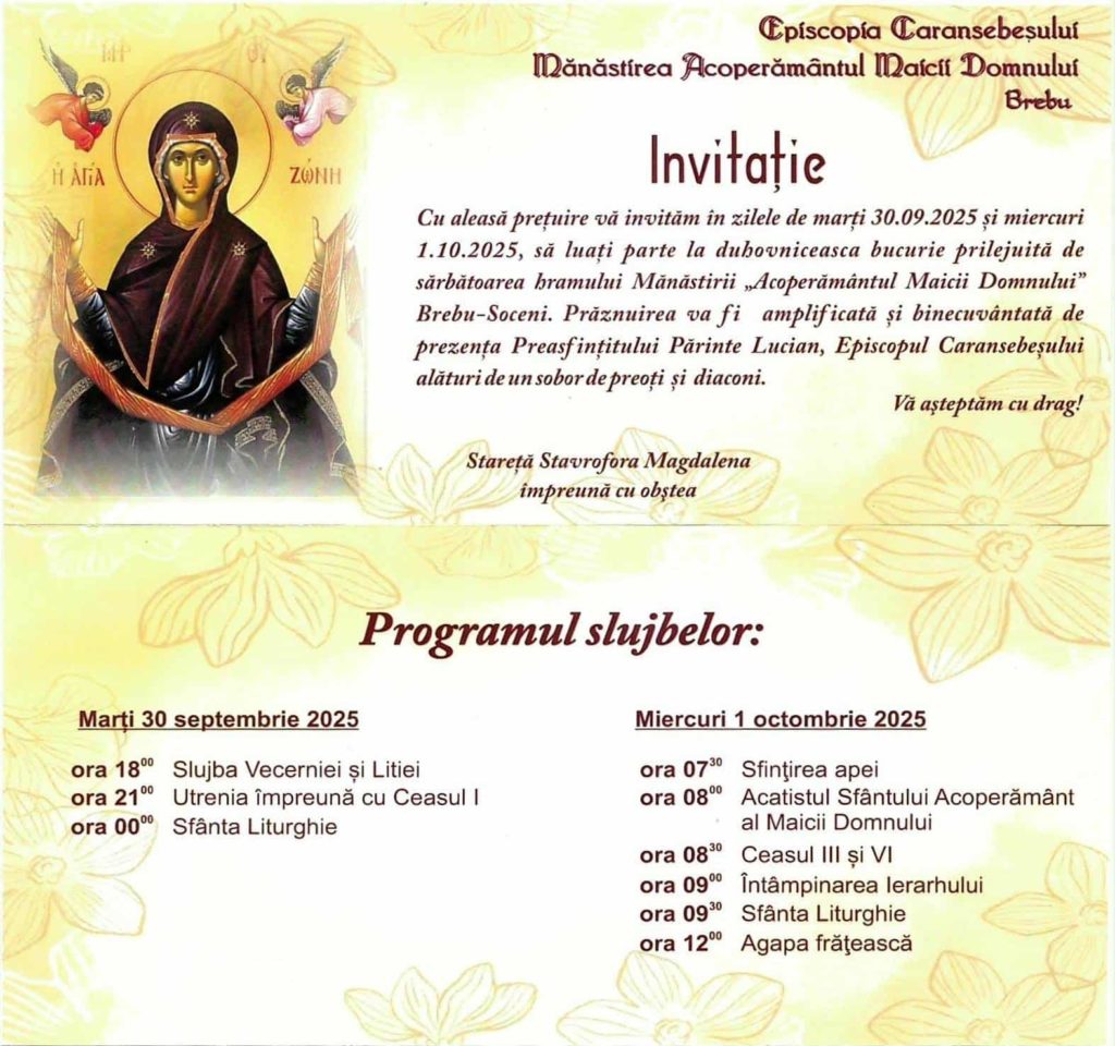Mănăstirea „Acoperământul Maicii Domnului” Brebu-Soceni, aflată sub binecuvântarea Episcopiei Caransebeșului, îi invită pe credincioși să ia parte la sărbătoarea hramului, organizată în zilele de 30 septembrie și 1 octombrie 2025. Evenimentul va fi marcat printr-un program liturgic deosebit, desfășurat în prezența Preasfințitului Părinte Lucian, Episcopul Caransebeșului, alături de un sobor de preoți și diaconi.