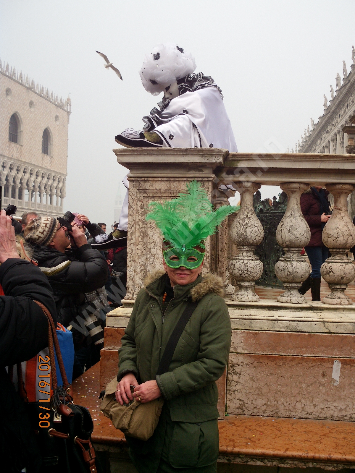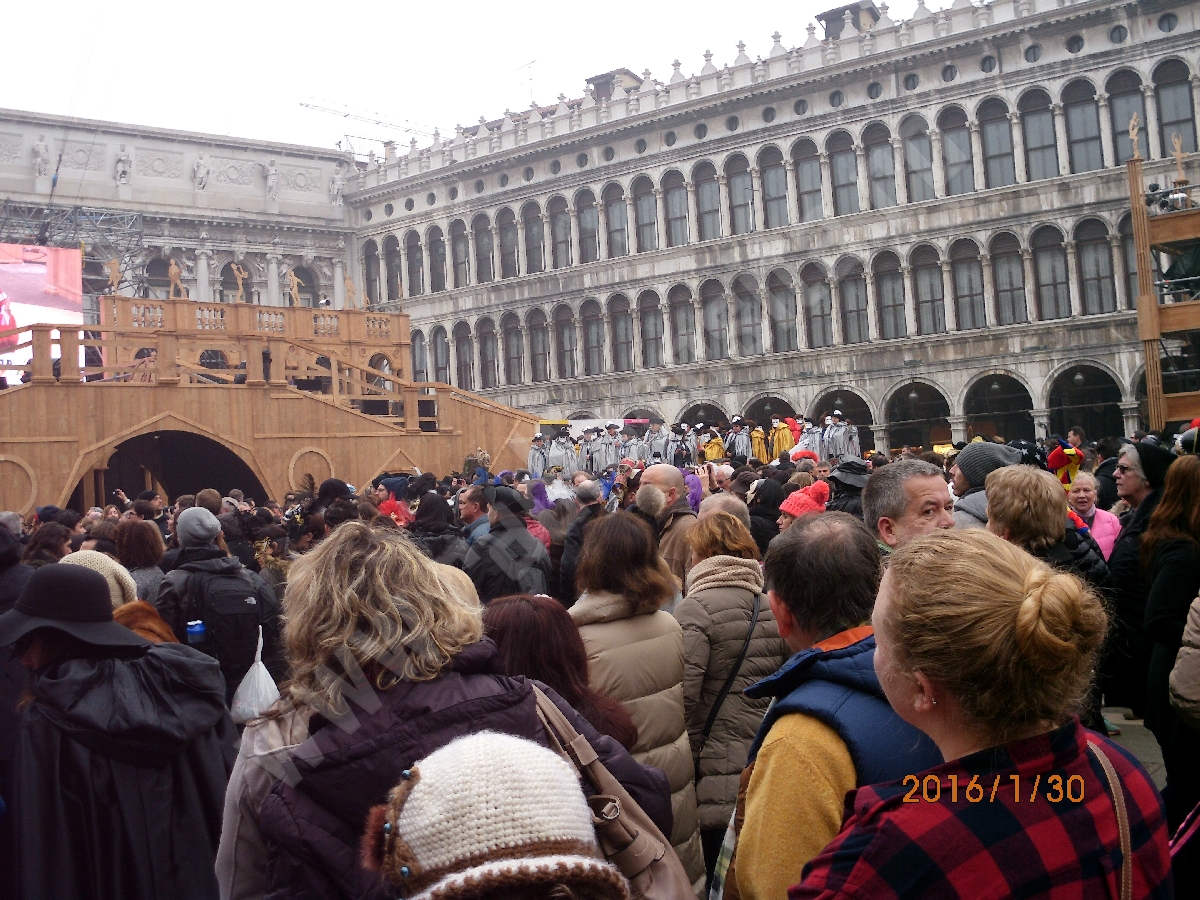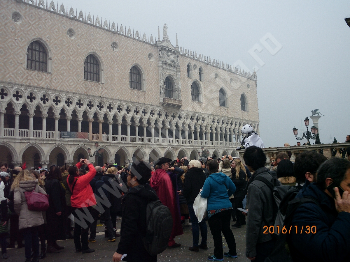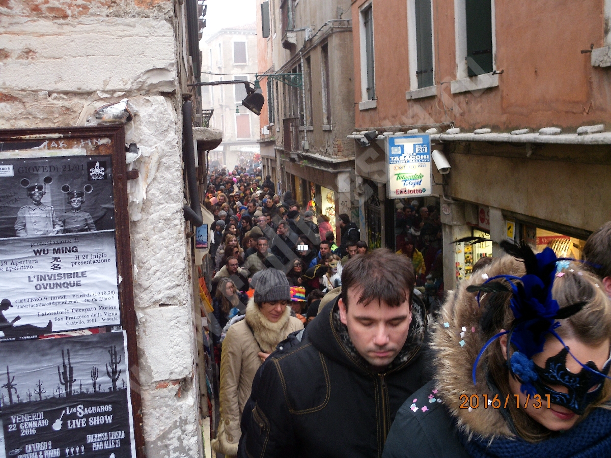 Pe străduțele Veneției și-au găsit loc tot felul de magicieni cu trucurile lor sau muzicieni din toată lumea, cu instrumente care de care mai ciudate.În Veneția, toată lumea se plimbă.Sunt foarte puține bănci unde să te poți odihni. Totul este mișcare.Înainte, înapoi, oriunde, pe niște străduțe în care doi oameni unul lângă altul sunt deja prea mulți. La un moment dat, am mers pe o străduță ca și cum stăteam la coadă: dacă cineva în față se oprea pentru o poză, toată strada era în așteptare. A, desigur, Carnavalul de la Veneția este și despre poze.Este ocupația principală. Toată lumea face poze la orice: un personaj, o clădire, o gondolă, o hârtie bătută de vânt. Deși, apropos, vântul bate doar în preajma Canalului Mare- Canal Grande.trebuie să vă mai povestesc și despre măsurile de siguranță luate duminică(31 ianuarie): poliția pur și simplu te trimitea pe un traseu anume, și nu pe unde voiai să te plimbi (a fost foarte bine, pentru că n-am mai rătăcit ore în șir până să ajungem în Piața San Marco – centrul carnavalului. În plus, paza obiectivelor de acolo, adică Palatul Dogilor sau Basilica San Marco erau păzite de mascați înarmați până în dinți.