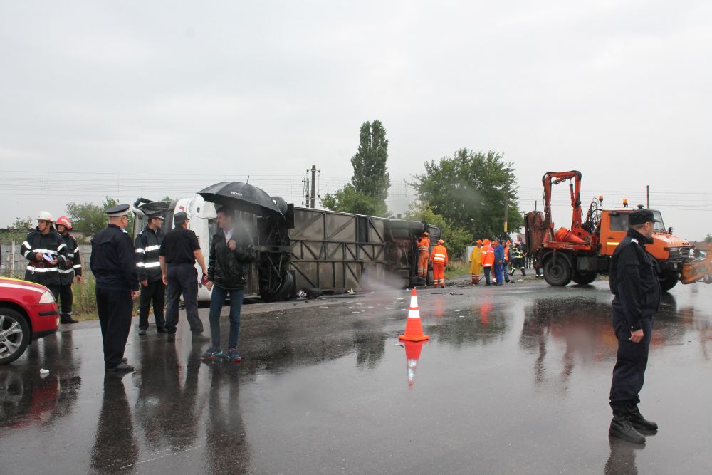 Autocarul, înmatriculat în Turcia, facea curse regulate pe ruta Istanbul-Bucuresti-Chisinau si s-a rasturnaţ miercuri dimineata, pe DN 2B (E 87), la Baldovinesti, în apropierea orasului Braila.
