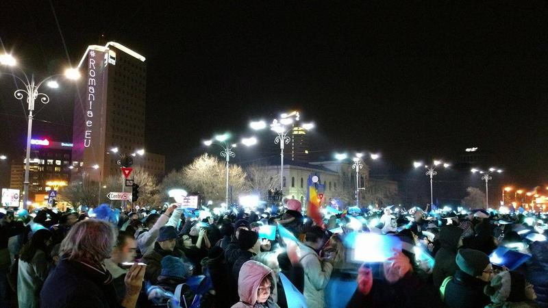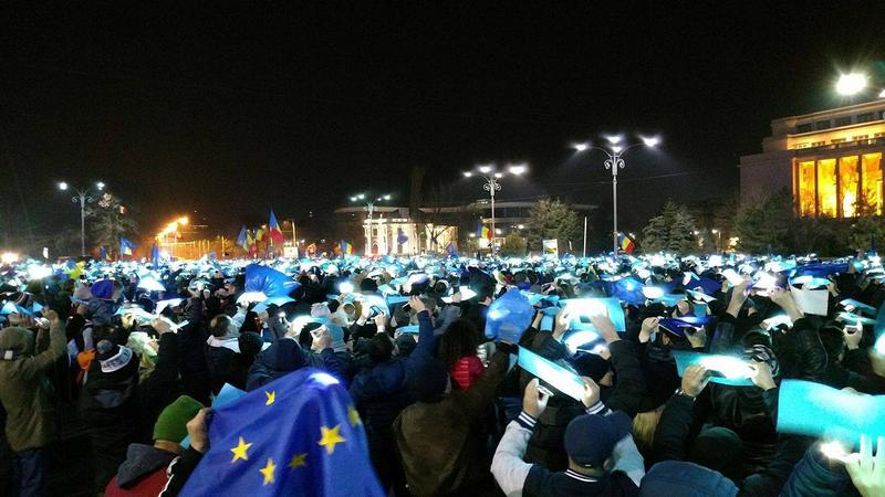 5.000 de manifestanţi au creat Steagul Uniunii Europene în Piaţa Victoriei cu hârtii colorate şi lumina de la telefoanele mobile, scrie digi24.ro.