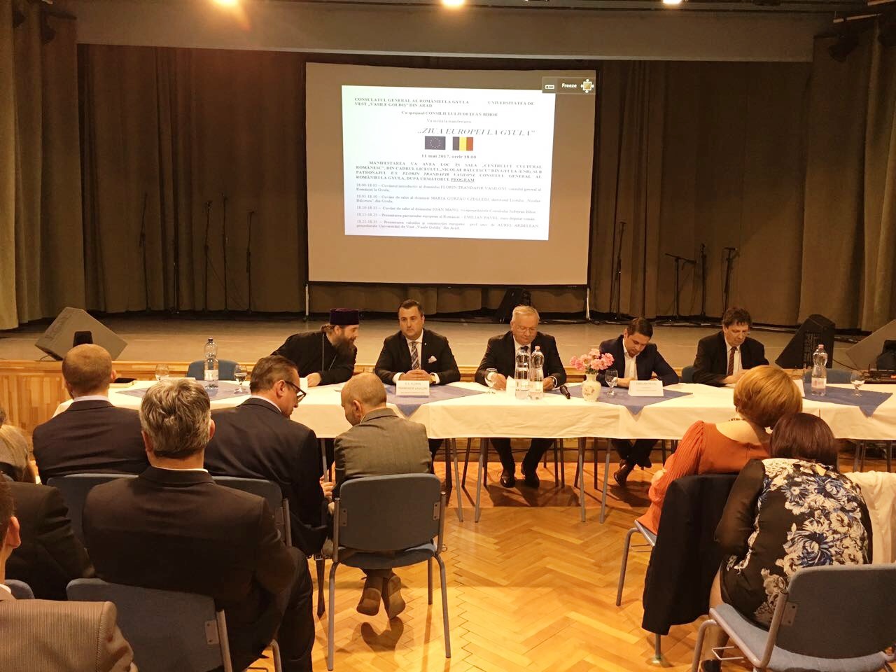 Consulul general Florin Trandafir Vasiloni a rostit cuvântul de deschidere, în care a subliniat tripla semnificaţie a zilei de 9 mai, şi anume amintirea proclamării independenţei de stat a României în anul 1877; încheierea celui de-al doilea război mondial şi Ziua Europei. Au luat apoi cuvântul Ioan Mang, vicepreşedintele CJ Bihor şi Emilian Pavel, euro-deputat roman, care au vorbit despre Uniunea Europeană şi rolul României în cadrul acesteiea. Prof. Marius Grec, a dat citire mesajului transmis de către rectorul fondator şi preşedintele Universităţii de Vest „Vasile Goldiş” din Arad, Aurel Ardelean. Au mai adresat cuvântări Maria Gurzău Czeglédi, prof. Mariana Nagy, prof. Cristian Benţe, reprezentant al UVVG şi Talik Dal, francez de origine, reprezentant al studenţilor de la UVVG.
