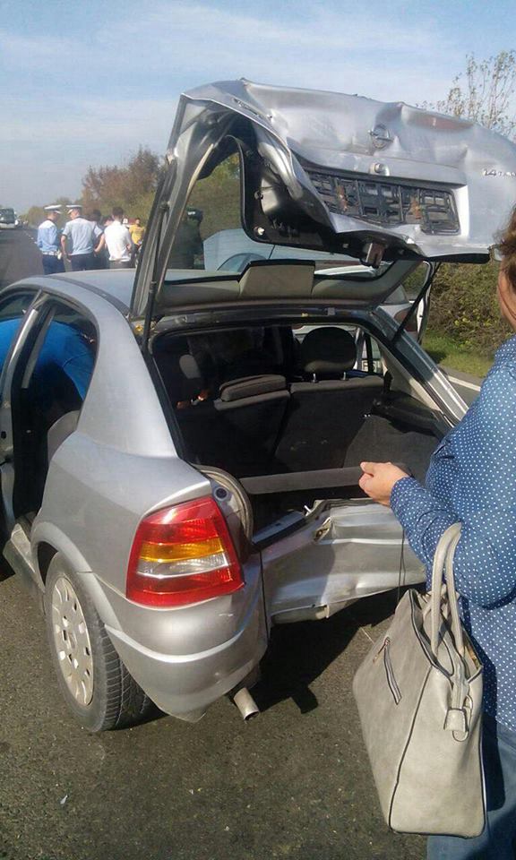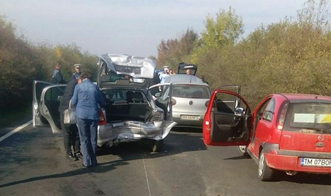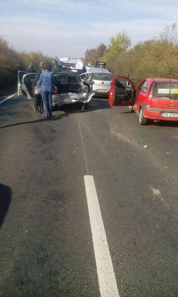 [FOTO] Accident cu 5 maşini, o motocicletă şi 15 persoane în judeţul Timiş