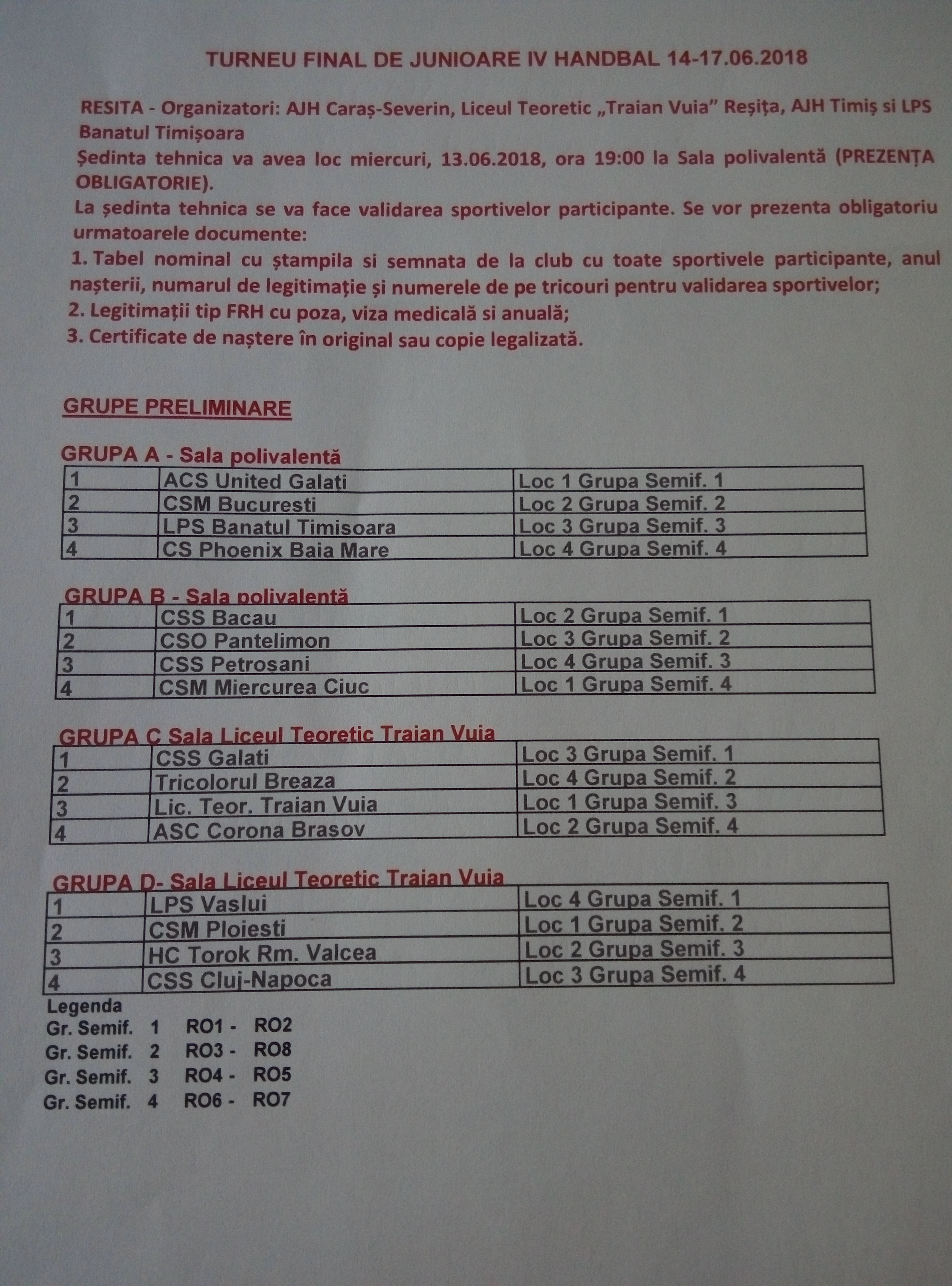 Turneul final de handbal al junioarelor IV se va desfășura la Reșița în perioada 14-17 iunie. Partidele se dispută, în paralel, la sala Liceului Traian Vuia și la sala polivalentă din municipiul de pe Bârzava.