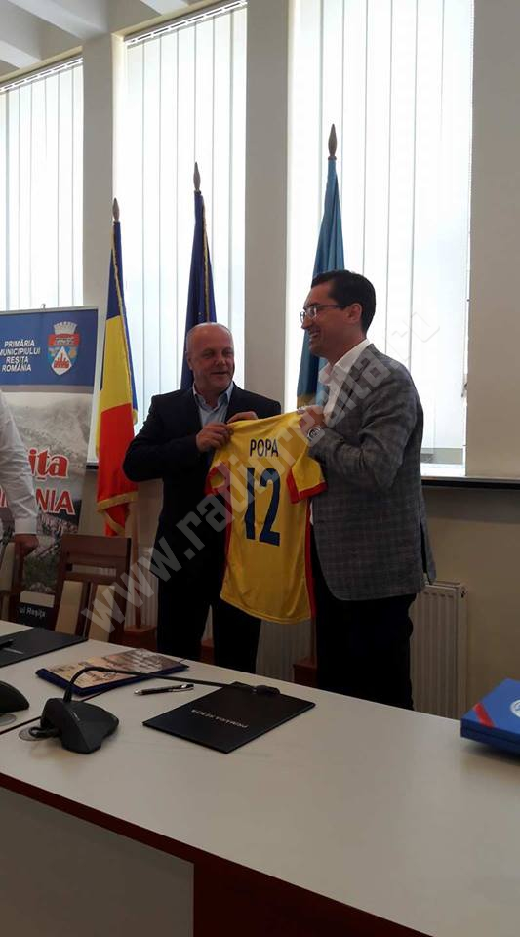 La finalul întâlnirii de astăzi, primarul Ioan Popa i-a înmânat lui Răzvan Burleanu un „Însemn de recunoştinţă” pentru dezvoltarea şi promovarea fotbalului din Reşiţa. La rândul său, preşedintele forului fotbalistic național i-a oferit un tricou al naționalei cu numărul 12, numărul suporterului.