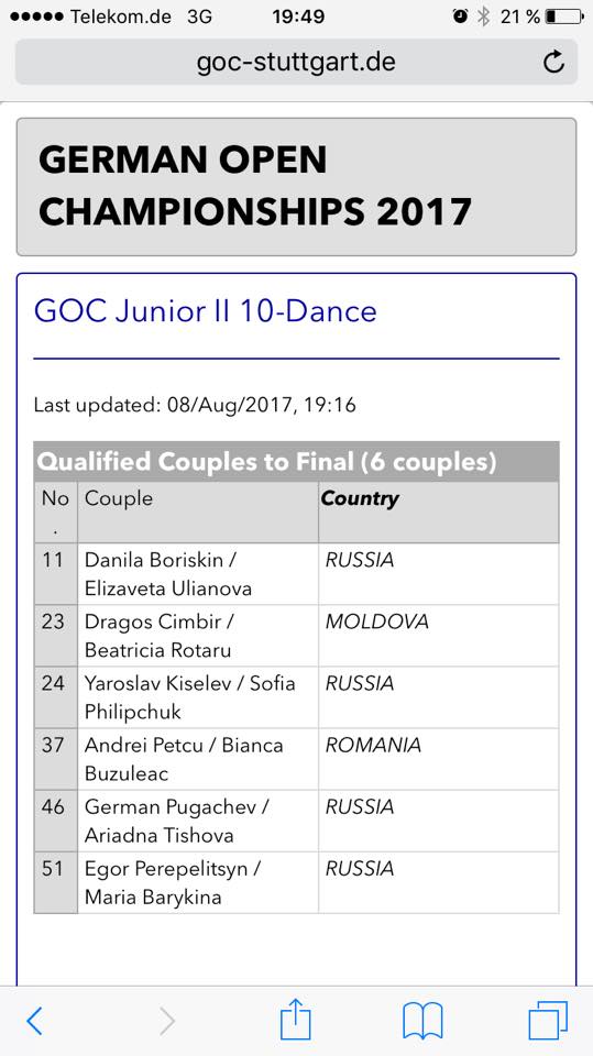 Concursul internațional de dans sportiv, ”German Open Championships 2017”, a aliniat la start, participanți din mai multe țări, precum : China, Turcia, Estonia, Rusia, Ucraina, Kazakhstan, Uzbekistan, Moldova, Polonia, Estonia, Ireland, Lituania și Germania.