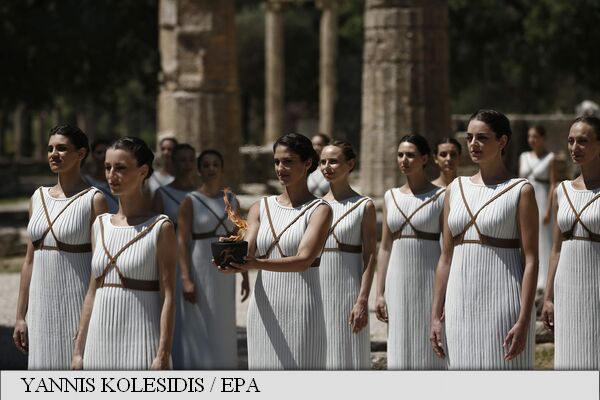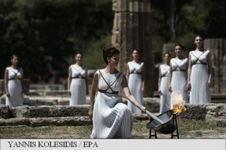 Actrițe îmbrăcate în rochii lungi de culoare albă și înconjurate de un cor l-au invocat pe Apollo, zeul antic al soarelui, la templul zeiței Hera, cu o vechime de 2.600 de ani. „Marea preoteasă” Katerina Lehou, o cunoscută actriță greacă, a captat razele soarele cu ajutorul unei oglinzi parabolice, pentru a aprinde flacăra.