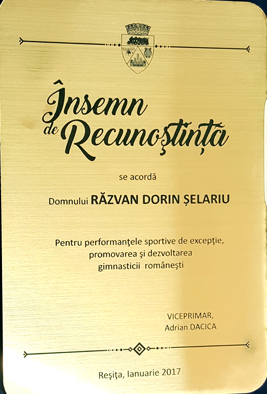 Reșița nu-și uită campionii. Fostul gimnast, Răzvan Șelariu a primit un însemn de recunoștință